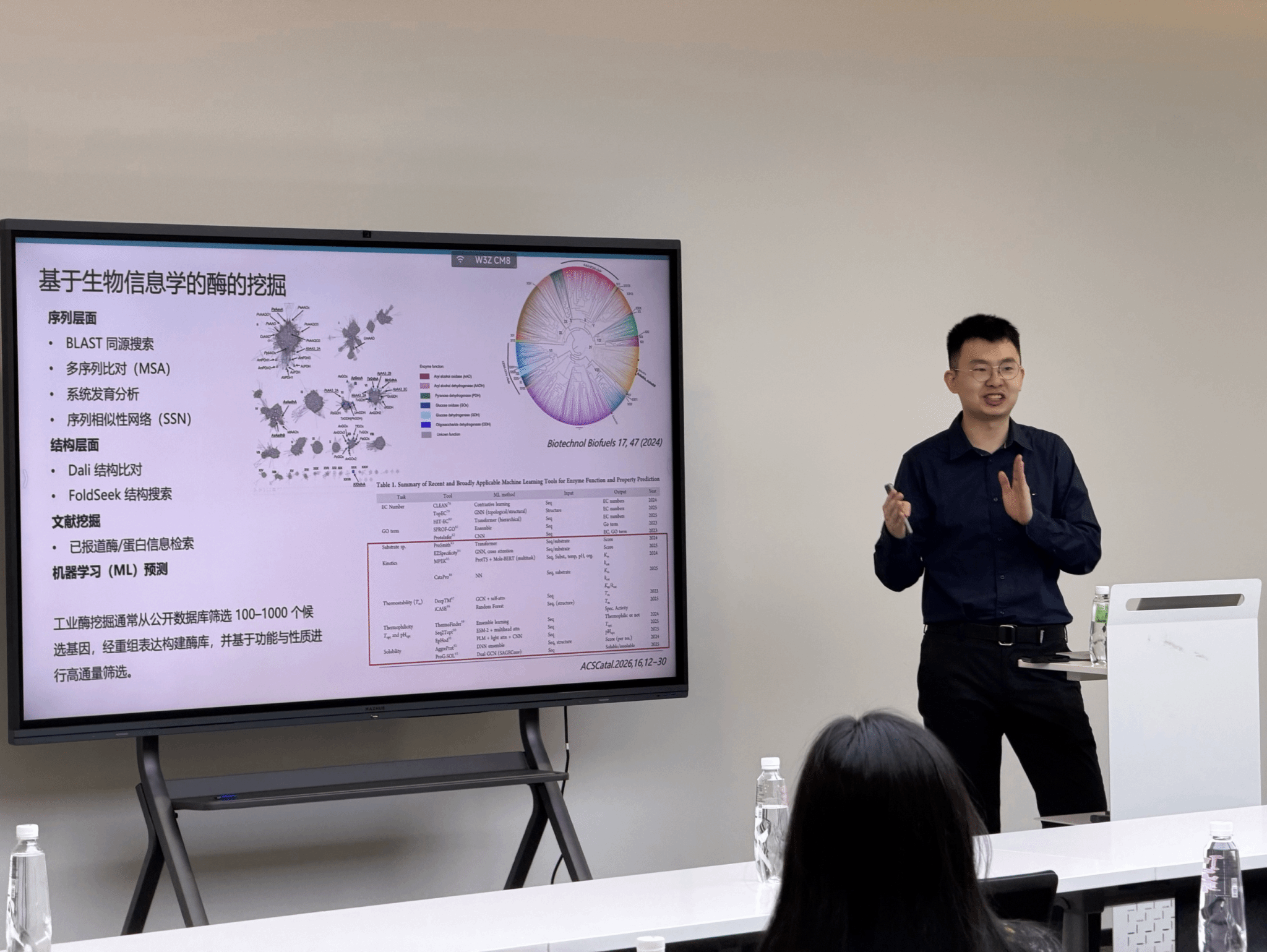报告会上,赵弘博以《酶制剂的生物智造和产业化》为题,系统介绍了生物制造产业的发展脉络与前沿技术。报告不仅涵盖了从传统生物制造到“生物智造5.0”的范式转变、工业酶的挖掘与高通量筛选等核心技术,更融入了赵弘博在酶制剂开发与转化实践中的宝贵经验。赵弘博详细分享了新一代植酸酶开发和果汁糖分减量等产业化案例,深入探讨了AI辅助蛋白设计在酶工程中的应用突破与当前面临的瓶颈,强调了湿实验验证在生物制造领域不可替代的核心地位,为在场师生呈现了一场理论与产业应用深度融合的学术盛宴。在互动环节,师生们围绕AI赋能酶工程的局限性、工业酶的规模化生产挑战以及数据驱动的酶定向进化技术等热点问题,与赵弘博展开了深入交流,现场学术氛围浓厚,讨论热烈而深入。